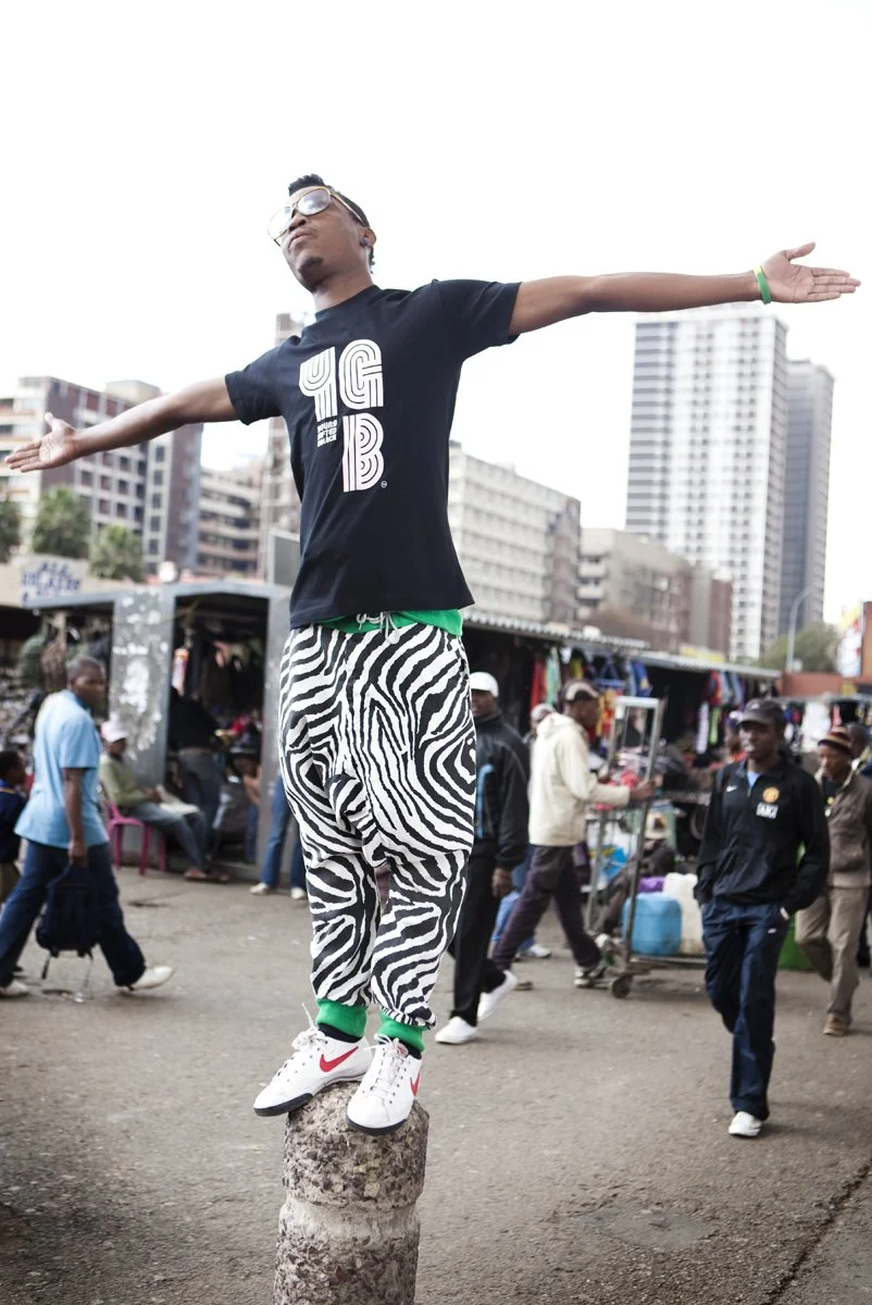 They are a DIY fashion "crew" consisting of Kepi, Sibu, Floyd, and Thabo. They took me to various fabric shops and clothing stores where they source the raw materials they adapt and combine to create their vibrant, outlandish creations. While walking through the city, they explained how they perceive their generation as different from the preceding one. Being too young to vividly remember the struggle for apartheid, they feel less politicized and assert that their current "struggle" revolves around combating blandness and conformity. To them, it's all about partying, self-expression, and challenging stereotypes. As Sibu, the guy in the red cape, expressed, "I was born into the free world, and some people accuse me of taking my freedom for granted. But to that, I say, 'Fuck you! It's my freedom to take for granted.'" Text by Rod Stanley / Dazed Magazine 2010.